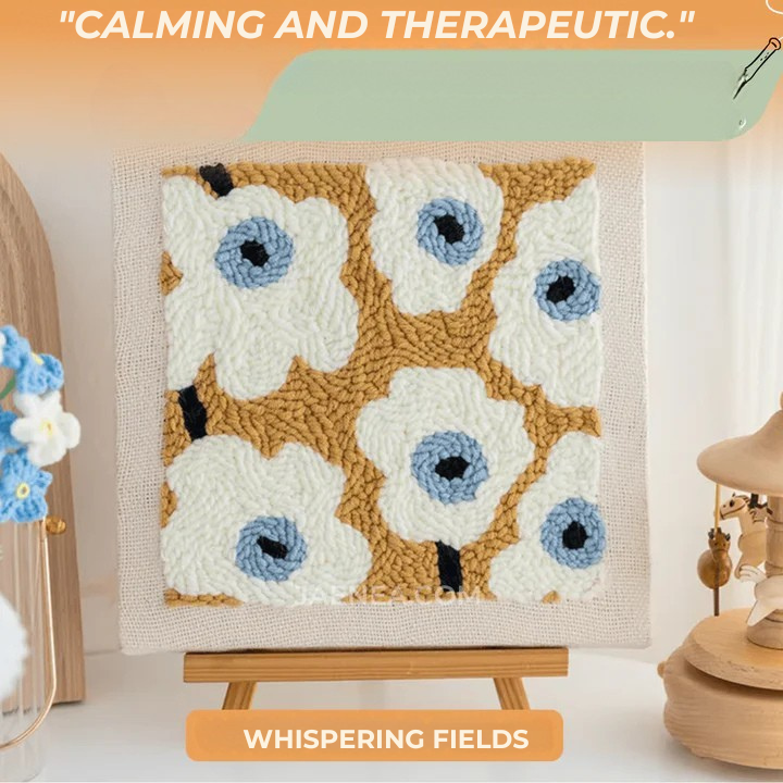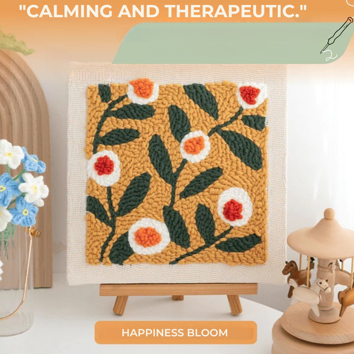 Sett inneholder en broderingsduk, en punch needle-nål og garnnøster til brodering.